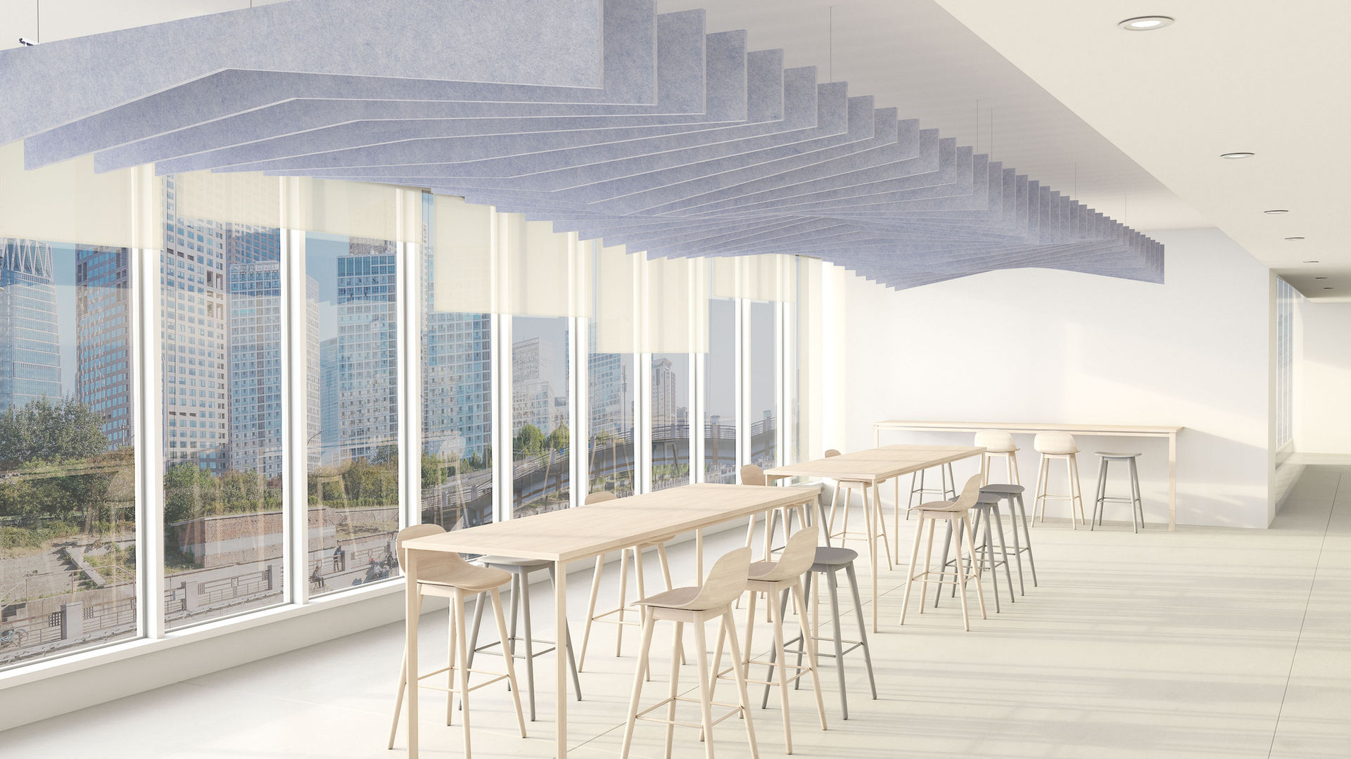 Angle Baffle is the stunning result of combining waves with angular lines. Assembled in the form of a cloud, each system can be effortlessly hung from the ceiling.